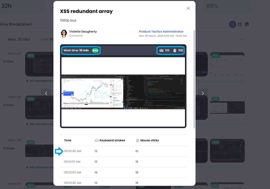 - A minute-by-minute breakdown of mouse clicks and keystrokes