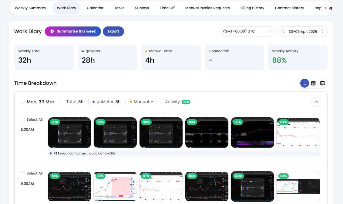 When the goMeter is active, screenshots are captured at random intervals (approximately every 10 minutes). You can review a full day of activity by accessing your freelancer’s Work Diary.
