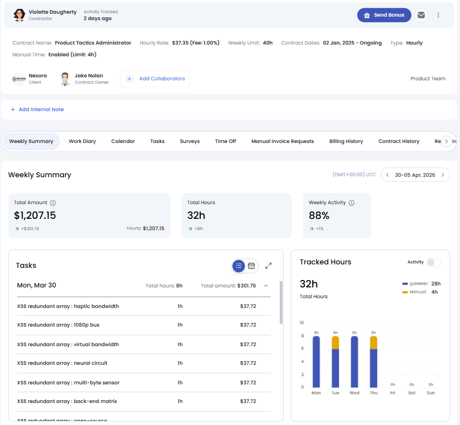 These contracts utilize the goMeter, an automated time-tracking system that captures random screenshots every 10 minutes. This tool provides clients with transparency into freelancer progress while streamlining the billing cycle. Clients can review all tracked hours; if no disputes are raised, payments are automatically processed and released.