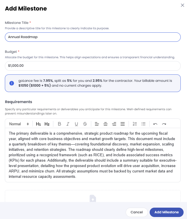 Creating milestones is easy. Just select a title, enter the budget, and add your requirements to get started.