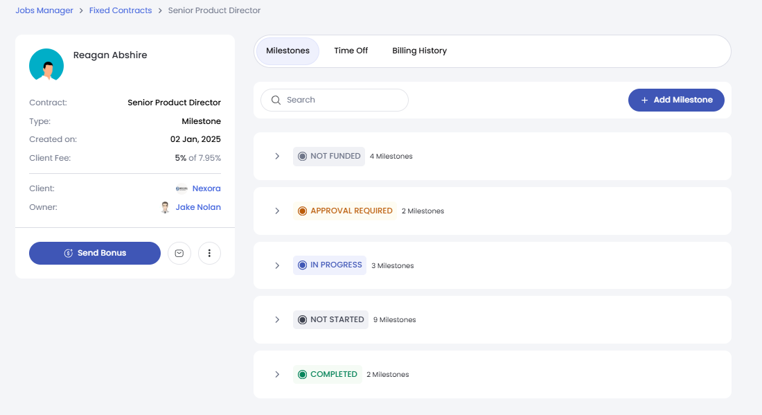 - Unfunded: The milestone awaits funding from the client to begin.
