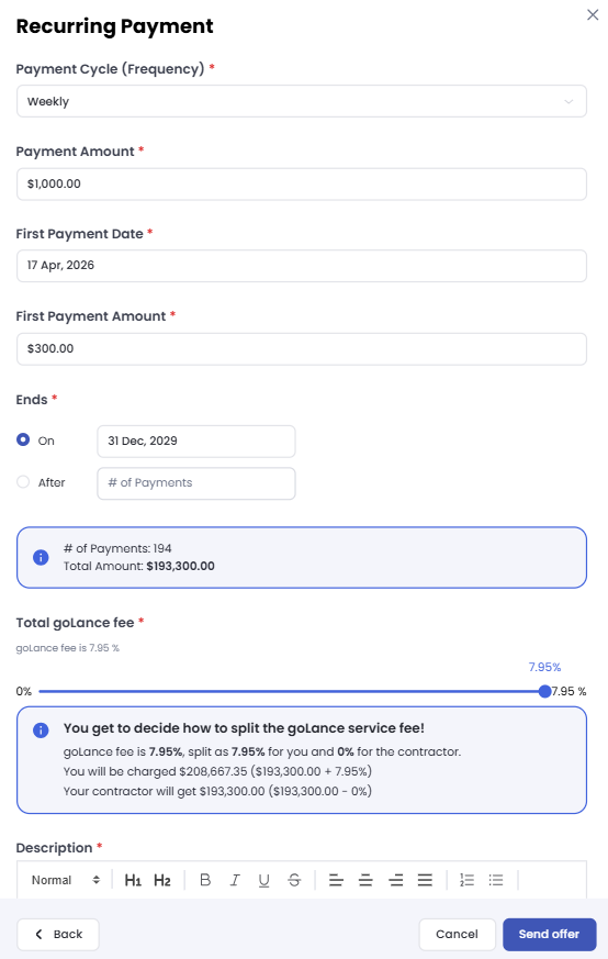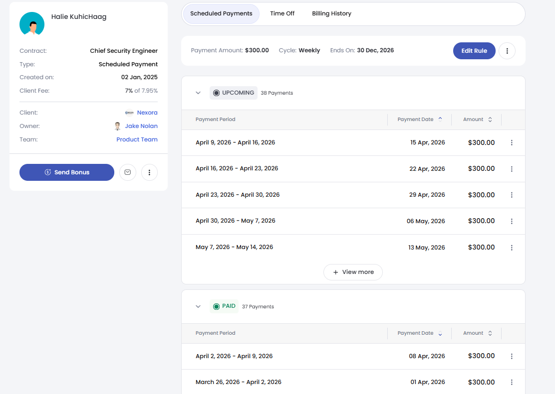 Simplify your payroll with scheduled payment rules. This feature gives you full control over your budget by allowing you to set the payment amount, frequency, and active dates for each contract. Once configured, payments are released automatically according to your schedule.