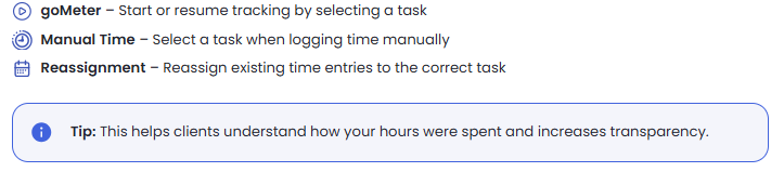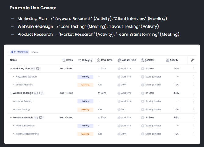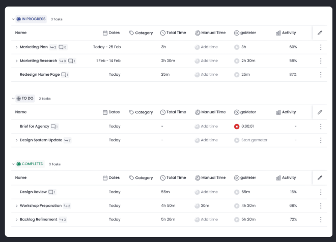 - Track time to tasks via manual time or goMeter
