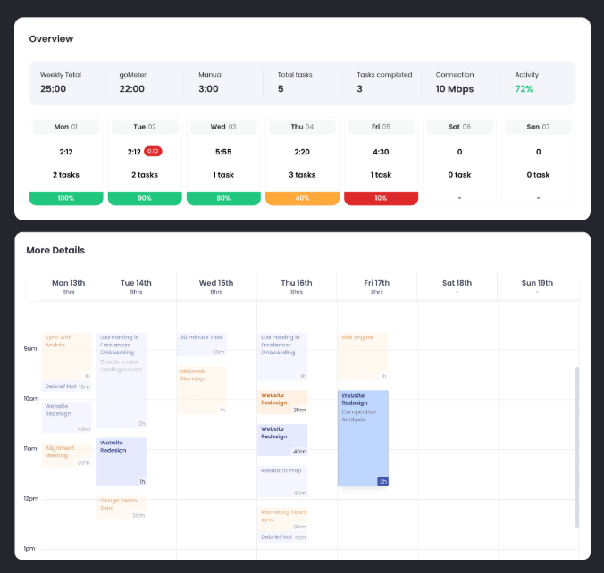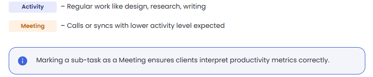 This ensures your client understands that lower activity levels are expected during meetings, so your productivity isn’t misinterpreted.