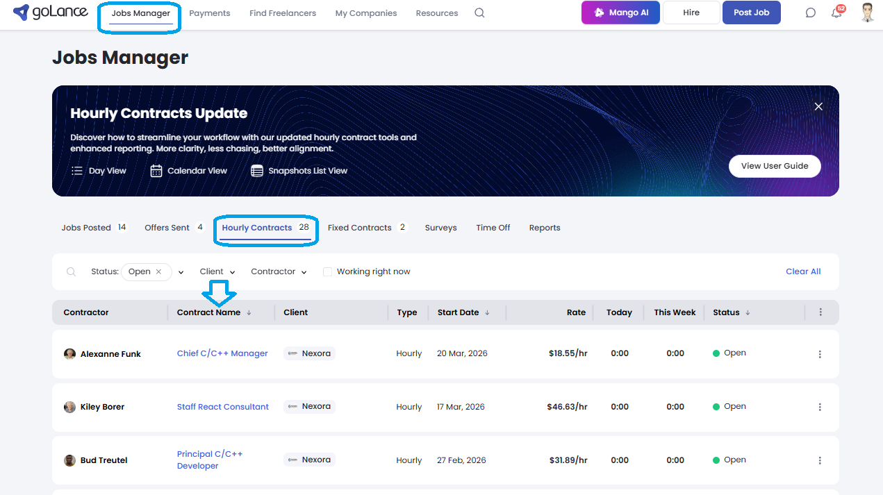 After reviewing your freelancer’s Work Diary, if you believe a dispute and refund are necessary, please log into your goLance account, navigate to the Jobs Manager tab, and select the contract you would like to dispute. Then, click on the contract name to proceed.