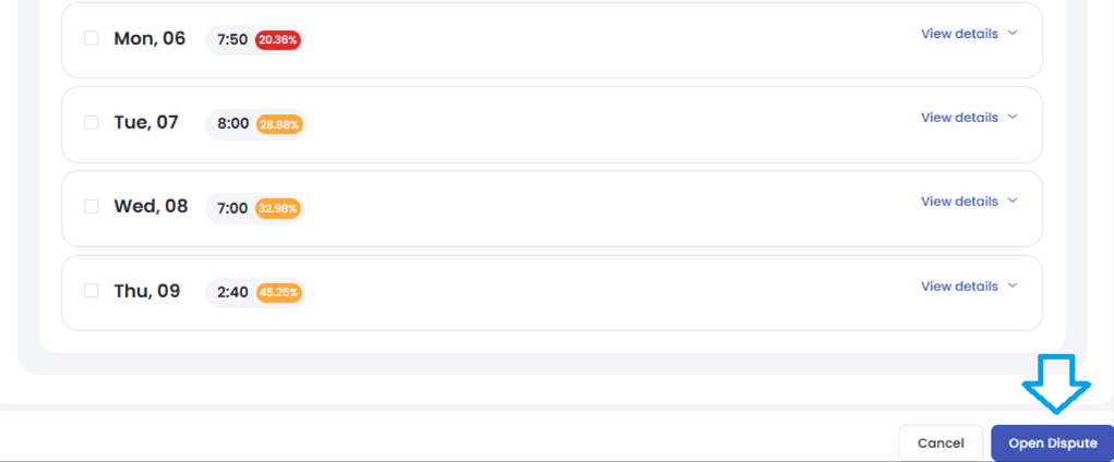 You can easily select an entire week, a specific day, an hour, or individual 10-minute screenshots by checking the corresponding boxes. To proceed, you’ll need to provide details explaining the reason for the dispute.