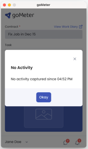 goMeter recognizes activity only when there are mouse clicks and keystrokes. Mouse movement and call activity are not considered activity, so you may see a “No activity” message if only mouse movement occurs.