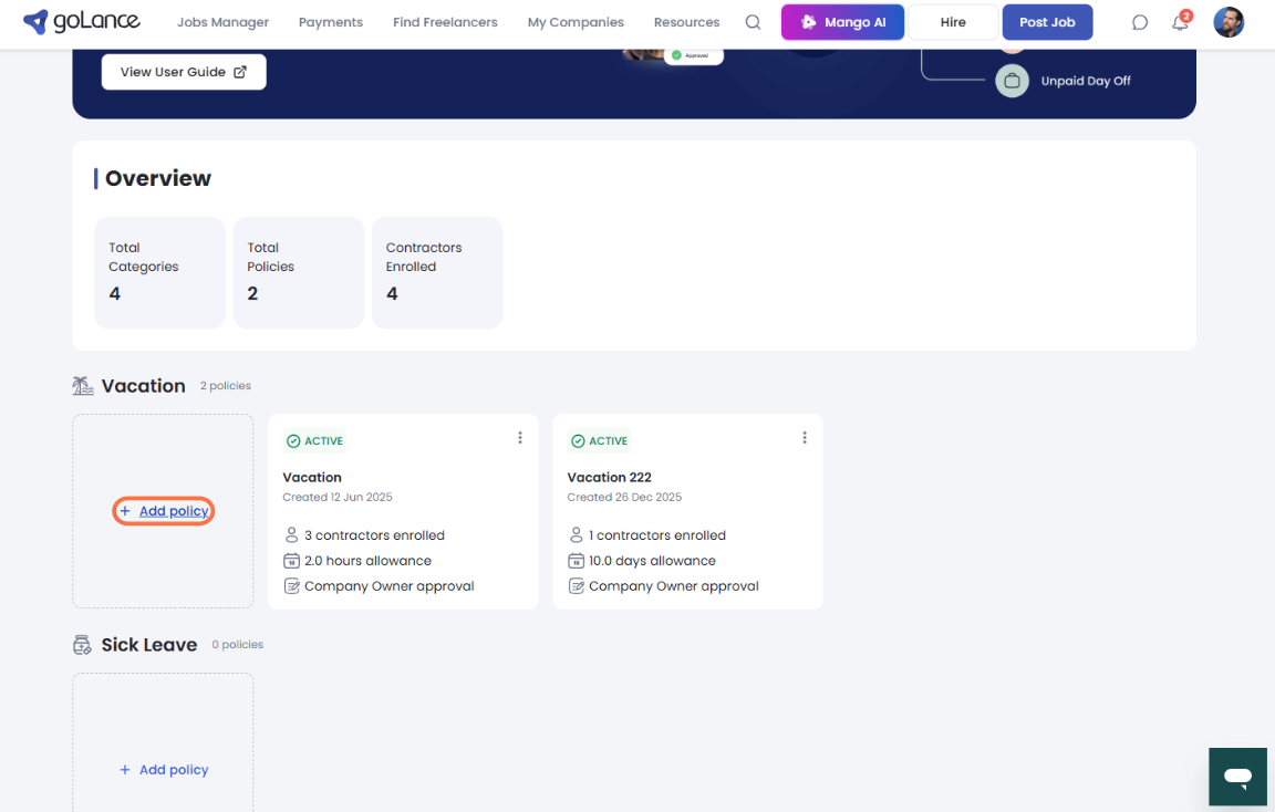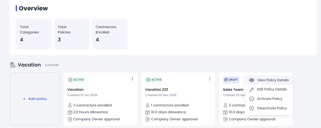 Select a Policy Category Choose the policy category you wish to create (e.g., Vacation, Sick Leave) and click Add Policy.