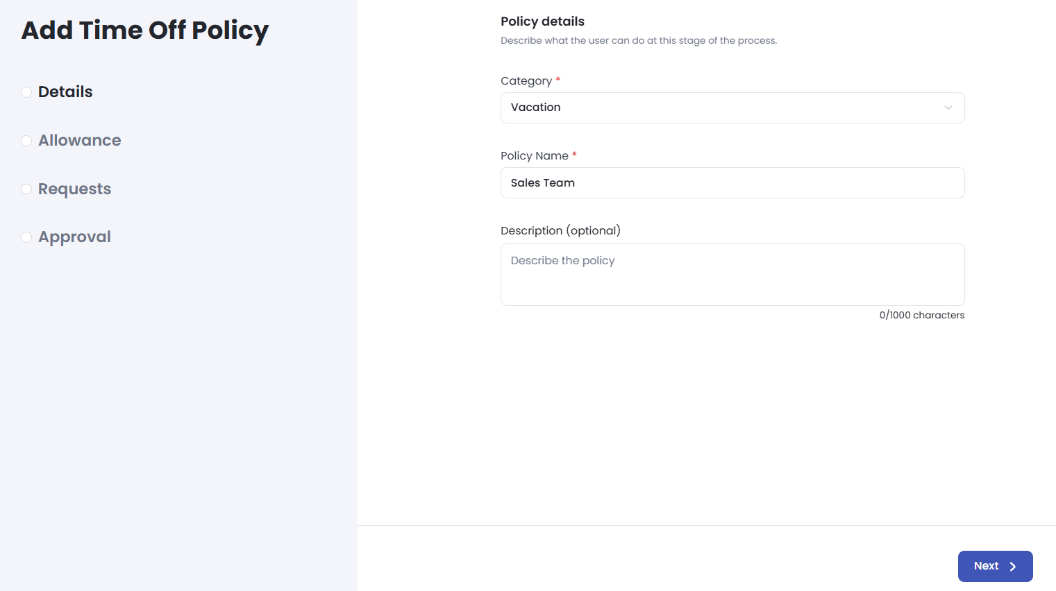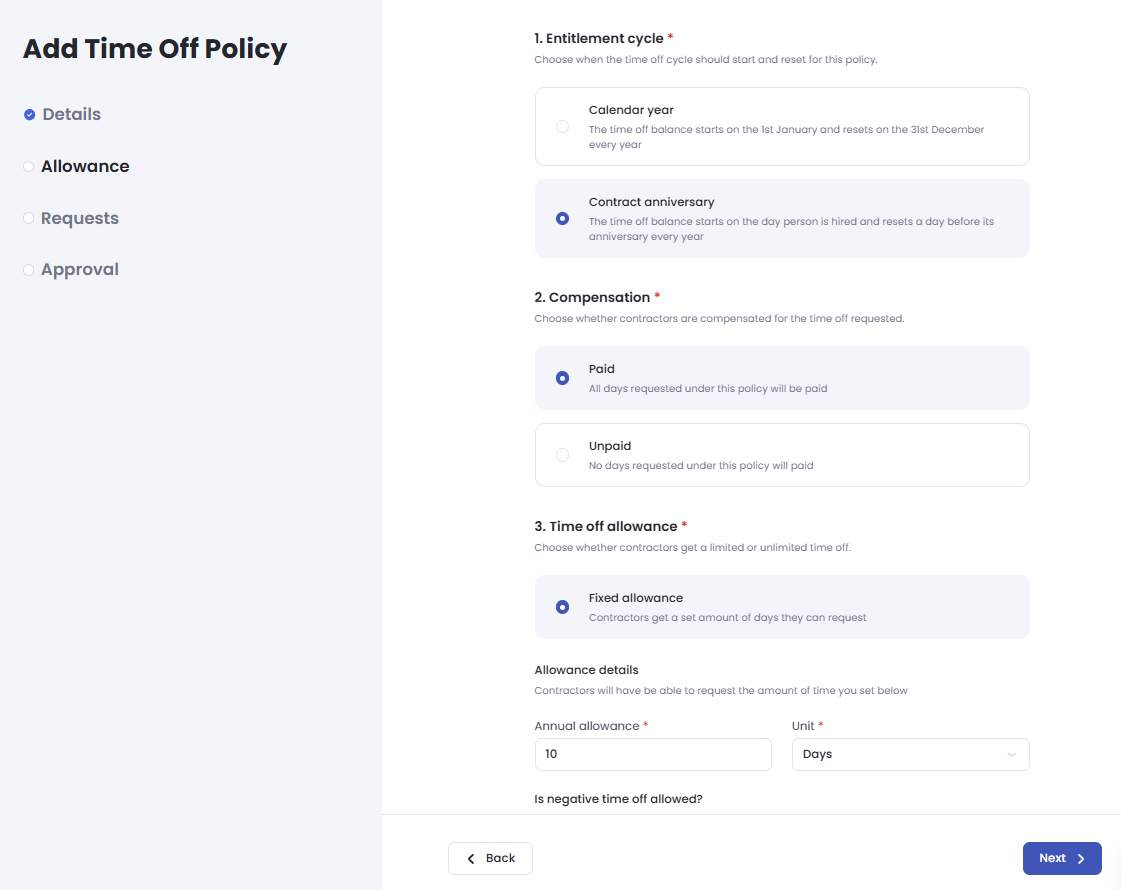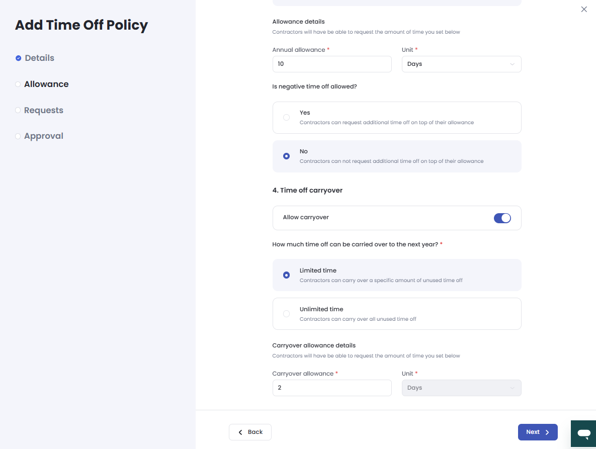 Configure Allowance Details Input the specific details regarding the time off allowance, such as accrual rates or annual limits.