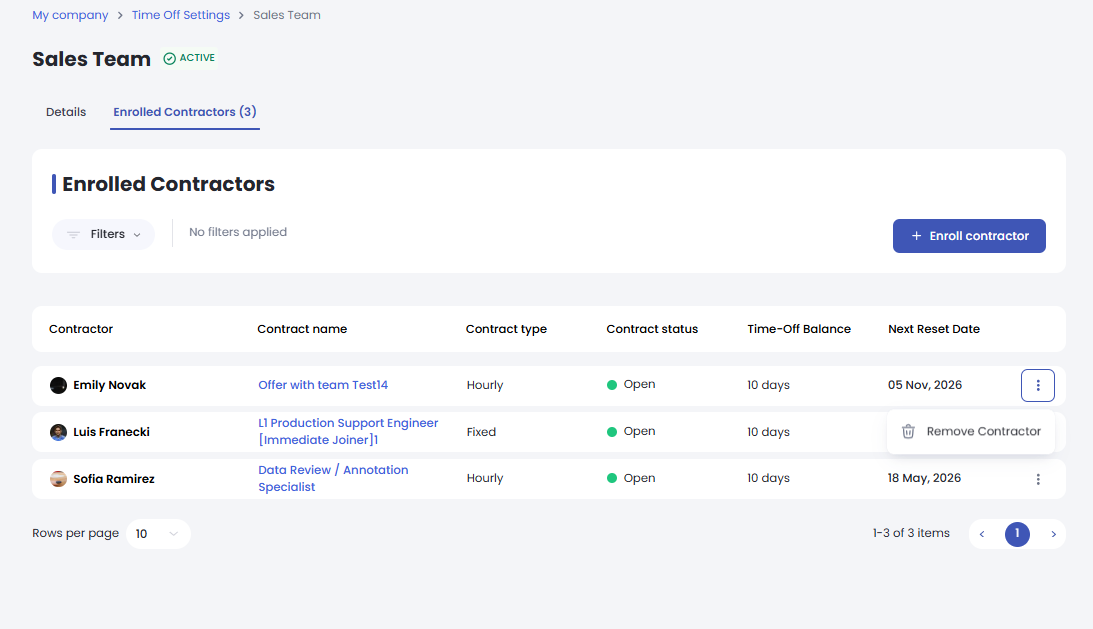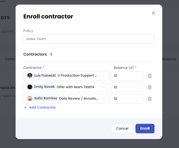 Enroll Freelancers Select the freelancers you wish to add, enter their starting balance, and click Enroll. You can remove and re-add members at any time if adjustments are needed.