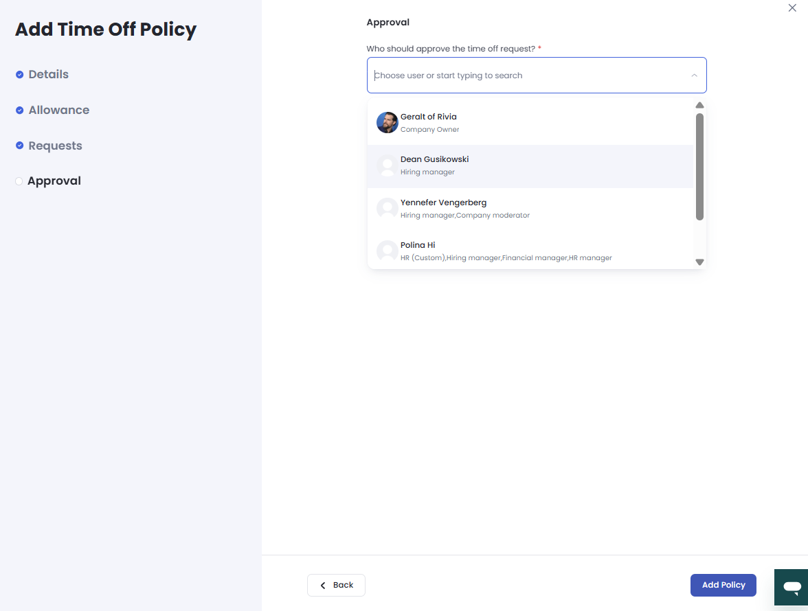 Assign an Approver Select the company member responsible for approving requests for this specific policy. Once selected, click Add Policy at the bottom.